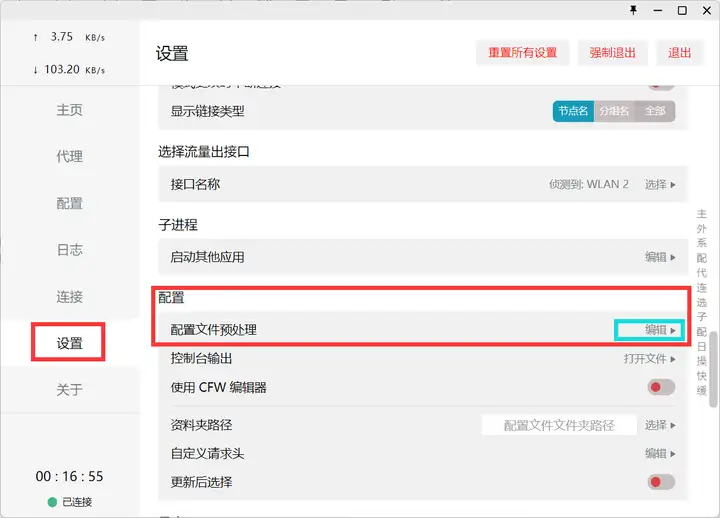 点左边的设置-配置-配置文件预处理(Parser),点击编辑,输入下列命令。