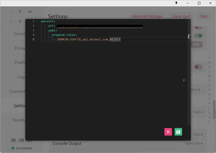 保存后在订阅里检查下是否已应用到Parser,然后刷新订阅,每次刷新,规则里都会自动添加这个屏蔽规则。